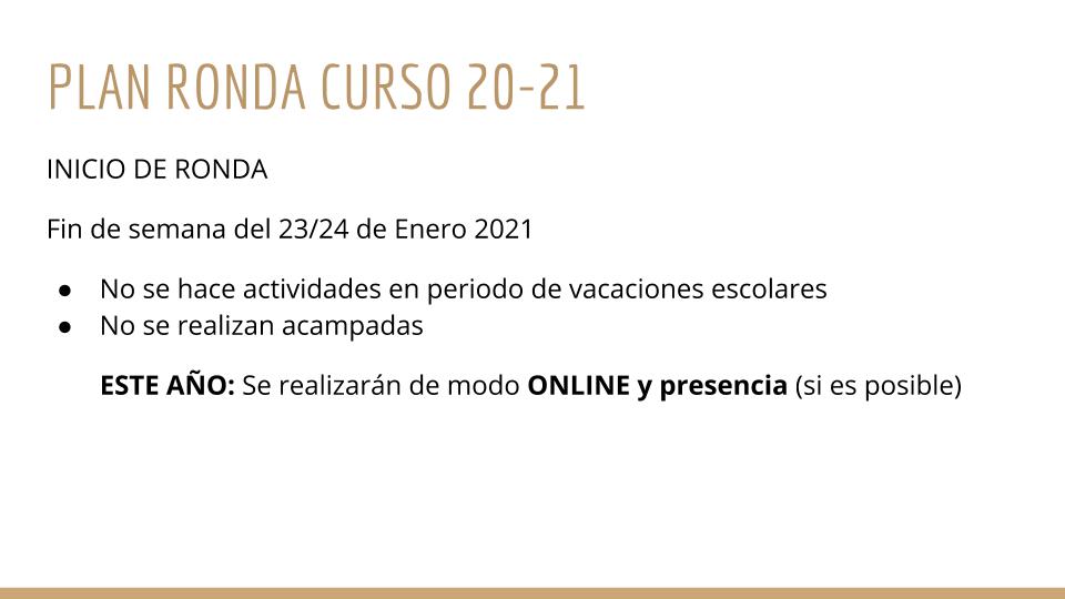 Como os veníamos contando, empezaremos con la ronda este mes. Para ello, realizaremos una reunión de padres el sábado 16 de enero a las 10:30h por videollamada, en la que os informaremos acerca de todas las actividades que tenemos previstas para este curso, así como el nuevo formato de estas y los protocolos que seguiremos para que sean seguras. Consideramos que la asistencia a dicha charla es de gran importancia para solucionar todas las dudas que pueda haber al respecto.